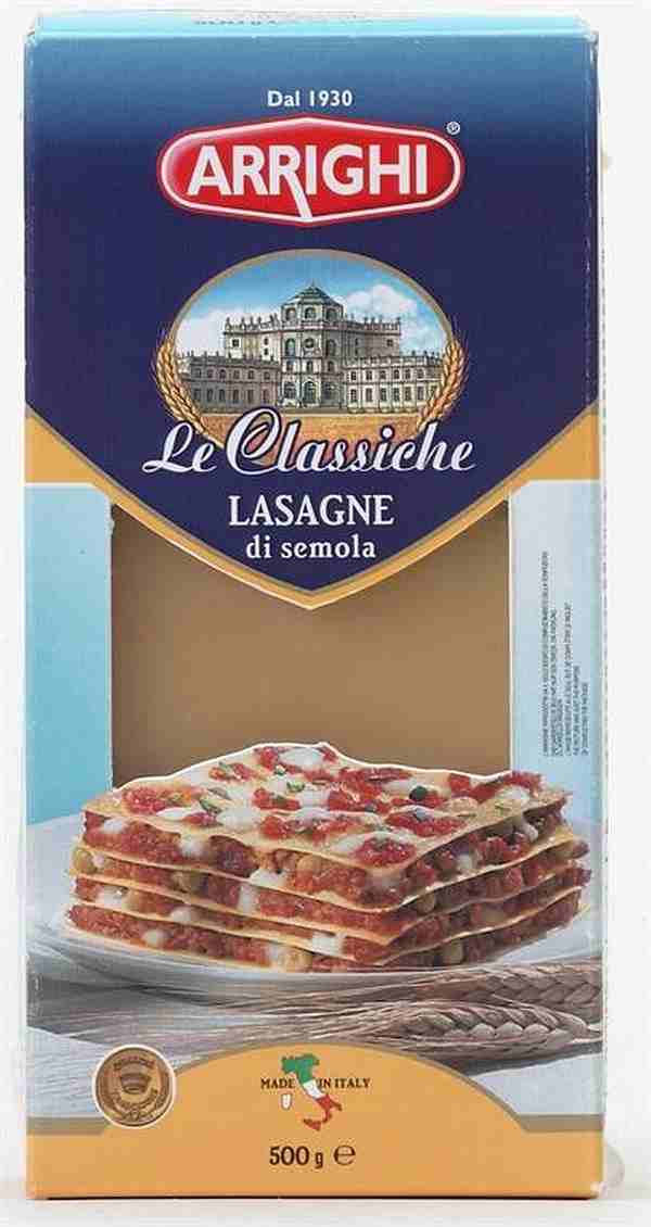 Lasagne Arrighi , podobnie jak wszystkie makarony tej marki, wytwarzany jest z semoliny, czyli pszenicy durum – najodpowiedniejszej do produkcji makaronów. W opakowaniu znajduje się 500 g najwyższej jakości płatów ciasta o szerokości ok. 10 cm, które ugotowane przekłada się w naczyniu żaroodpornym różnorakimi smakowitymi warstwami jarskimi lub mięsnymi i zalewa np. beszamelem.